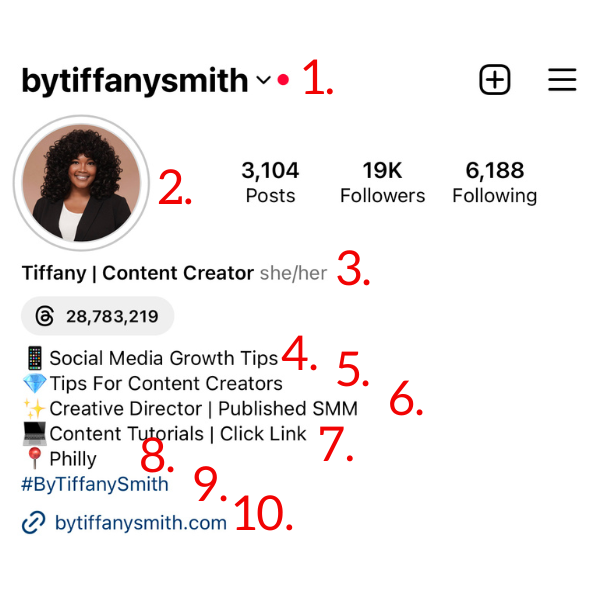 Choose a username that is easy to remember and relevant to your brand or personal identity. Avoid using special characters or numbers that might confuse people. Make sure your username across ALL social platforms is the same. You never know where your traffic may come from, make it easier for your audience to find you.