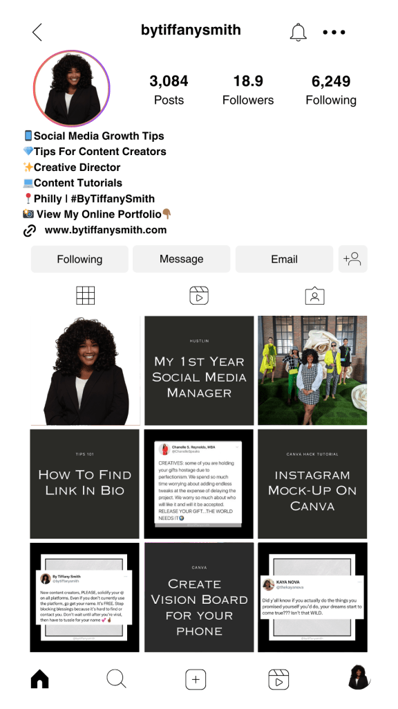Link to your website that WORKS. Make sure you test your weblinks and “walk” your websites often to verify your website is user-friendly, catches any errors, and every service is within three clicks on your site. Include a clickable link to your website or a landing page. You can use tools like Canva website to showcase multiple links if needed. Get the look of “linktree” without losing the engagement. You want your followers on something you OWN.